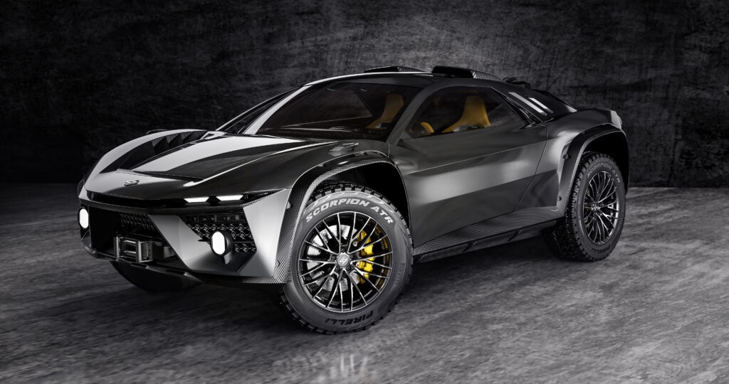 En la imagen de abajo se muestra un hipercoche que asalta el desierto y que rivalizará con el último par de autos deportivos todoterreno, el Huracan Sterrato y el 911 Dakar. Pero con un tren motriz eléctrico, será único en su clase y ciertamente atraerá a los entusiastas adinerados.